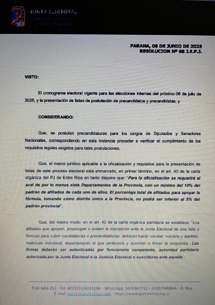 La decisión dejó fuera de competencia a otras cuatro listas que se habían presentado para participar en los comicios internos: la N° 1 “Agrupación Evita”, la N° 7 “Por una Entre Ríos Potencia”, la N° 10 “PAR – Peronismo Amplio Renovador” y la N° 177 “Tres Banderas”. En todos los casos, según el texto de la resolución Nº 08 de la Junta Electoral Partidaria, no alcanzaron los mínimos exigidos para la oficialización, principalmente por no reunir el porcentaje necesario de avales distribuidos territorialmente.