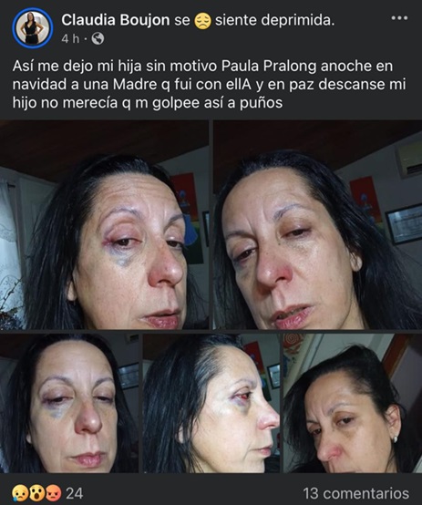 «Así me dejó mi hija sin motivo, Paula Pralong, anoche en Navidad. Una madre no merece ser golpeada así a puño.»