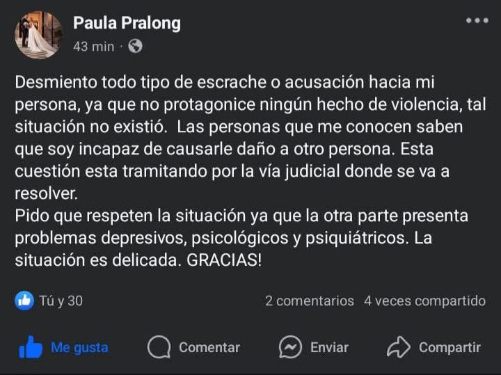 El conflicto se originó a partir de una publicación en Facebook realizada por Claudia Boujon, suegra de Jaurena, quien compartió una fotografía de su rostro con hematomas (Foto), acompañada de un texto en el que acusaba a su hija Paula Pralong y a su yerno de no intervenir mientras, según ella, era golpeada durante la noche de Navidad.