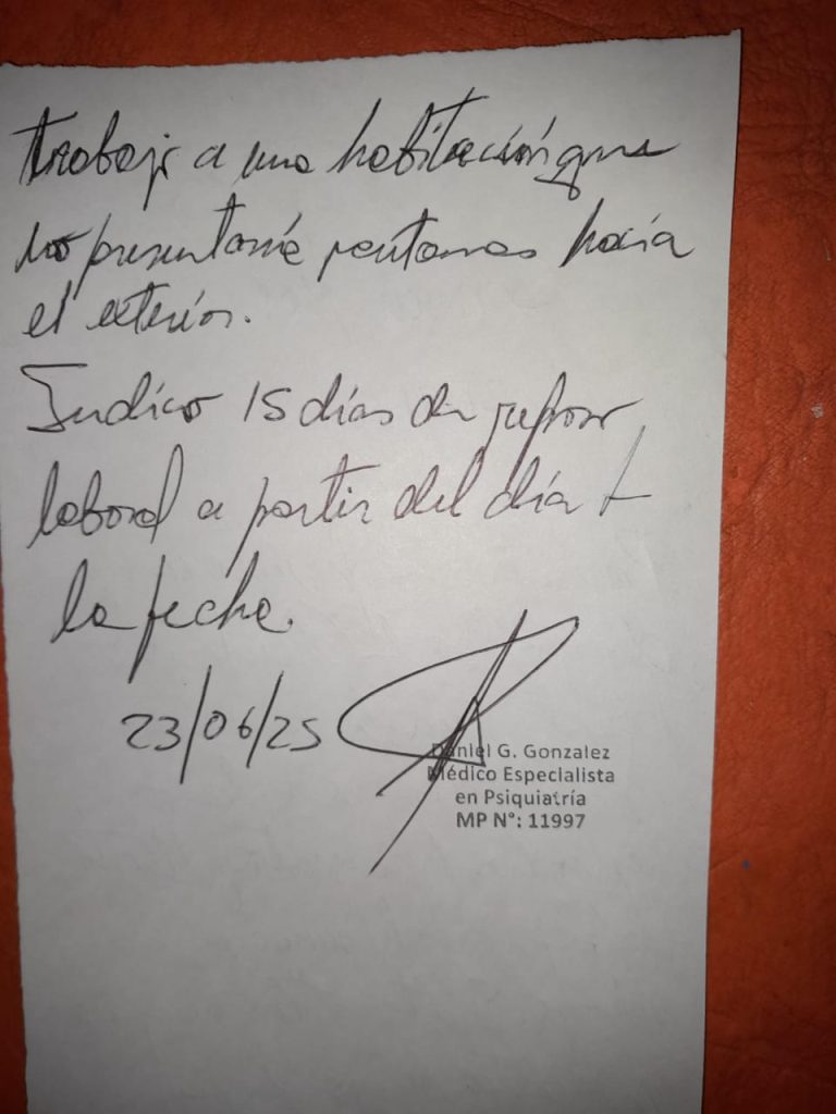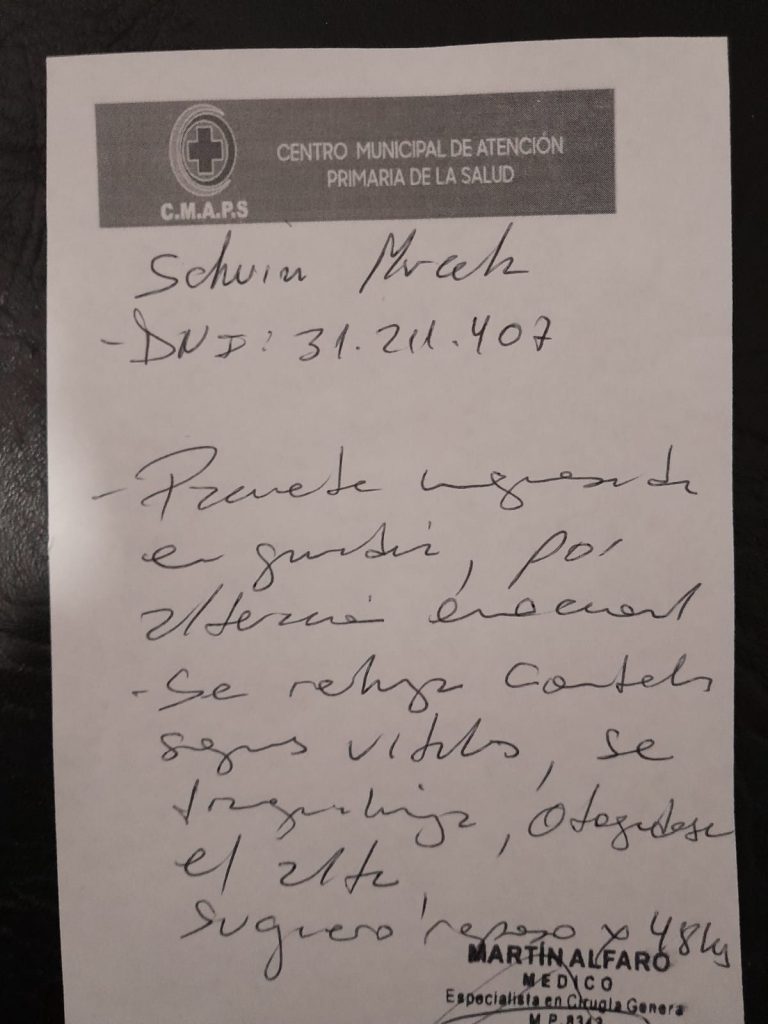 Según pudo saber Diario del SUR Digital, Marcela Schvin fue atendida por el médico Martín Alfaro, que a su vez es concejal del bloque justicialista de Puerto Yeruá y hombre justamente allegado al intendente Benítez por ser justamente concuñados. Mediante un certificado médico, Alfaro señala a Schvin como “paciente atendida en guardia con alteración emocional” y sugiere 48 horas de reposo. (Ver imagen):