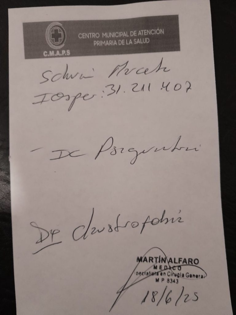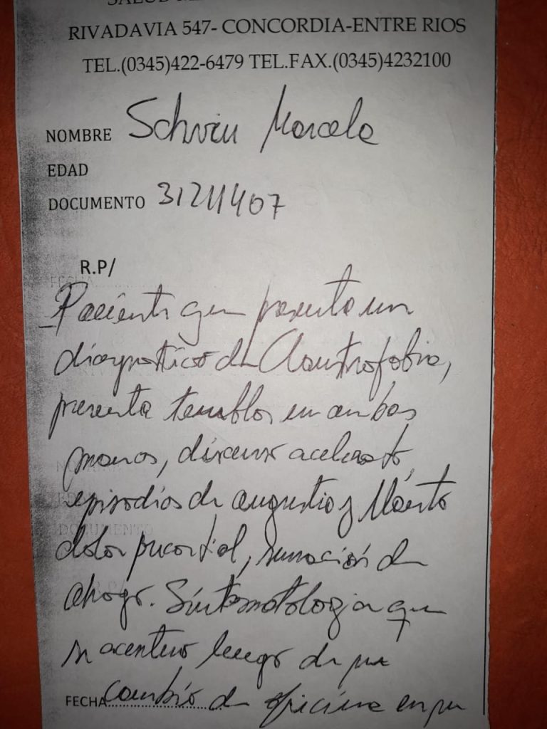 Todo esto conllevó a que la trabajadora solicite una entrevista con un médico psiquiatra, gastos que fueron cubiertos por Marcela Schvin, para que se diagnostique si precisamente sufre de claustrofobia, lo que resultó positivo, según consta en la siguiente certificación firmada por el profesional, Daniel González: