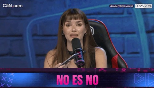 Agustina Peñalva, periodista, conductora del Programa “Andate a dormir vos”, que se transmite por C5N, donde rompió el silencio sobre la situación desesperante que estaba atravesando, y relató haber sido acosada durante meses por un hombre que no conocía ni conoce. En pleno aire del programa describió cómo recibía mensajes, seguimientos en redes y hasta se presentaba en lugares habituales que ella frecuentaba.