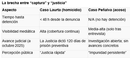 Comparación con Laurta: Mientras que el caso del uruguayo recibió recursos policiales inmediatos y cobertura constante, el acoso que vive Peñalva, y el de cientos de mujeres que pasan por esa misma situación —un delito tipificado como “acoso” — se mantiene en un limbo burocrático.