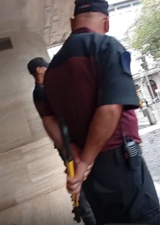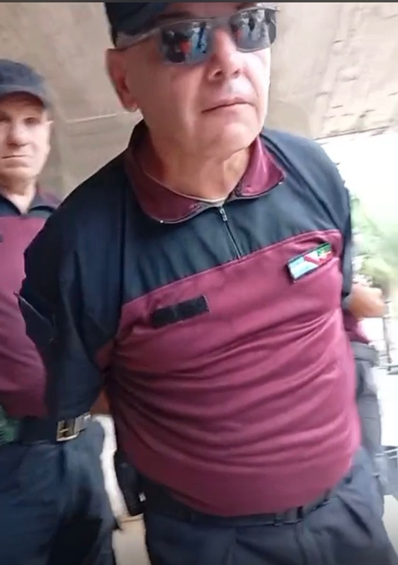 Uno de los agentes del orden con anteojos de sol, tenía en su poder una herramienta corta cadenas de gran tamaño, que la escondía en la parte posterior de su cuerpo, mientras miraba como acechando o amenazando a las indefensas mujeres (foto).