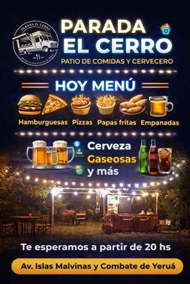 Parada del Cerro: Oscar y Mónica, crearon un espacio en el marco de un ambiente que nos invita a desconectarnos del bullicio diario y reconectarnos con el entorno natural que nos rodea. Música que se deja escuchar, pero que te deja hablar. El menú es variado, tipo food truck, ricos y muy bien presentados. Un plus que le suma a este lugar, y que da ganas de quedarse, su ambientación disoluta, podés sentarte en un living de exterior, o debajo de una pérgola rústica que le da un toque romántico. Para cerrar, destaco los tragos de Mechy, preparados en su justa medida, me encantó la cristalería. Muy buena onda y excelente atención. Abierto de martes a domingos. Martes a viernes a partir de las 20 horas, y sábados y domingos, desde las 9 hasta las 19 horas ofrecen meriendas como licuados y productos de panificación, de 20 horas en adelante, cena y tragos.