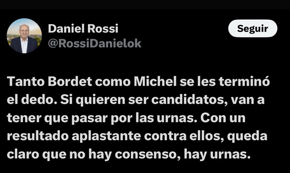 Frente a los dichos de Bordet, uno de los máximos rivales que el diputado tiene dentro del espacio, Domingo Daniel Rossi, recogió el guante y refiriéndose puntualmente a la publicación, posteó un mensaje en sus redes sociales, en la que habla tanto del legislador como de Michel, exigiendo internas y repudiando, como viene haciendo desde hace tiempo, el «dedo» para definir candidatos: «Queda claro que no hay consenso, hay urnas», sentenció.